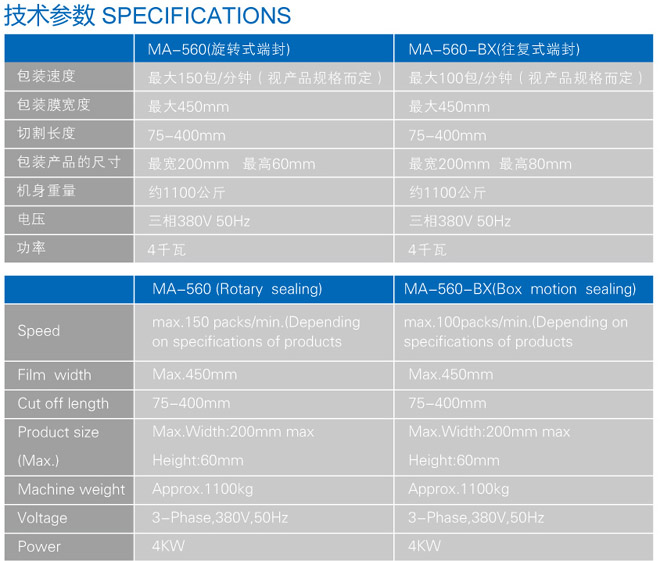 下供膜形式,适于包装各种无托盘产品,复合产品及棒状产品。